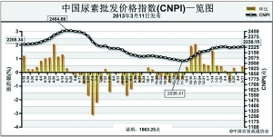 上周(3月4日-3月8日)国内春耕用肥缓慢启动,需求相对疲软,价格稳中有升。3月11日CNPI为2238.15点,环比上涨9.02点,涨幅为0.40%;同比下跌30.19点,跌幅为1.33%;比基期上涨374.90点,涨幅为20.12%。CNPI持续7周呈现窄幅震荡运行。