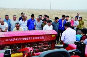 种肥同播,提高农业生产效率,渐成为行业热点。图为石家庄双联复合肥有限责任公司“肥机一体化”施肥现场,在示范播种时,当地老乡们兴趣高涨,争相观看机具现场演示,测量深松深度,查看播种情况。江亚丽 摄