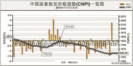 上周(6月30日-7月4日)国内尿素市场总体保持稳定运行。7月7日CNPI为1601.22点,环比下跌1.54点,跌幅为0.10%;同比下跌258.04点,跌幅为13.88%;比基期下跌262.03点,跌幅为14.06%。