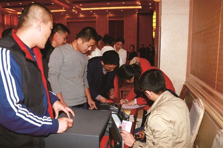 近日,红日阿康全营养水溶肥新品发布会在山东省临沂市召开。红日阿康全营养水溶肥采用旋光塑化造粒,容纳了植物所需的多种营养元素并辅以土壤生物酶,含有快速分解营养、促进吸收的土壤调理剂,使肥料生产工艺更环保、产品营养更全面、营养吸收率更高,因此广受农民欢迎。图为农民在排队订购。李从容 杨 振 摄