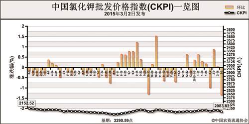 上周(2月23日-2月27日),中国氯化钾批发价格指数小幅下跌。3月2日中国氯化钾批发价格指数(CKPI)为2083.83点,环比下跌29.15点,跌幅为1.38%;同比下跌68.69点,跌幅为3.19%;比基期下跌1206.76点,跌幅为36.67%。