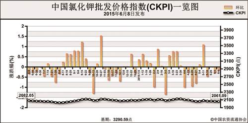 上周(6月1日-6月5日),中国氯化钾批发价格指数小幅下跌。6月8日中国氯化钾批发价格指数(CKPI)为2061.09点。环比下跌3.48点,跌幅为0.17%;同比下跌20.96点,跌幅为1.01%;比基期下跌1229.51点,跌幅为37.36%。