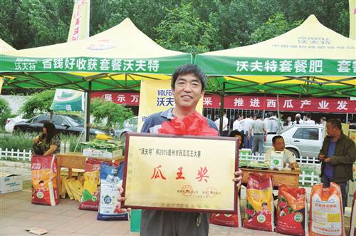 经过了近两个小时的评选,瓜王在期待中诞生了。来自王打卦镇李孟楼村的任善华以总分第一名的成绩勇夺瓜王桂冠。任大哥究竟有什么诀窍能够让自己的瓜脱颖而出呢?他说:“种瓜有三招:育苗、施肥、管理。我的瓜育苗都是自己做,育苗品种是京欣一号;我种瓜三十年了,跟西瓜有感情,深知精心管理挺重要;另外最重要的就是要科学施肥。施肥一定要用大品牌,我用的是沃夫特新推出来的套餐肥,底肥选择沃夫特硝基103和生物菌肥搭配使用,既活化土壤,又能够促根壮苗;到了膨果期用套餐里的高钾水溶肥进行冲施,同时配合叶面肥喷施,吸收快,营养更全面。今天我的西瓜拿了冠军,归功于西瓜甜度高,口感好,这与沃夫特套餐肥科学的养分搭配是分不开的。”