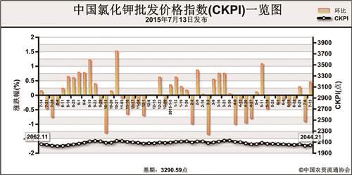 上周(7月6日-7月10日),中国氯化钾批发价格指数小幅上扬。7月13日,中国氯化钾批发价格指数(CKPI)为2044.21点,环比上涨9.11点,涨幅为0.45%;同比下跌17.90点,跌幅为0.87%;比基期下跌1246.38点,跌幅为37.88%。