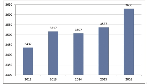经济作物结构持续调整。主要经济作物产量总体仍保持较高水平。油料、蔬菜、水果和茶叶产量增加。2016年,全国油料产量达到3630万吨,比2012年增加193万吨,增长5.6%,年均增长1.4%;蔬菜、水果和茶叶产量分别达到79780万吨、28351万吨和240万吨,比2012年分别增长12.6%、17.9%和34.1%,年均增长3%、4.2%和7.6%。棉花和糖料减产。受库存积压较多、需求下降和价格总体走低的影响,棉花产量下降较多。2016年,棉花产量为530万吨,比2012年减少154万吨,下降22.5%。2016年,糖料产量为12341万吨,比2012年减少1144万吨,下降8.5%。