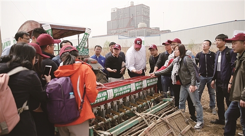 同时,为了让大家更了解“种肥混播”的方式,美盛公司还特别委派了当地的农机手进行现场模拟播种。在“哒哒哒”的发动机声中,肥料和麦种在经过改造的“Y”字型播种管道中均匀地播种在同一种沟内。工作人员还专门让现场的农民挖沟进行观测,清晰直观。