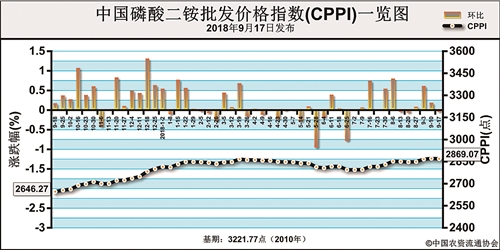 上周(9月10日-9月14日),磷酸二铵企业主供预收订单发货,价格高位企稳运行。9月17日中国磷酸二铵批发价格指数(CPPI)为2869.07点,环比下跌1.91点,跌幅为0.07%;同比上涨226.68点,涨幅为8.58%;比基期下跌352.70点,跌幅为10.95%。