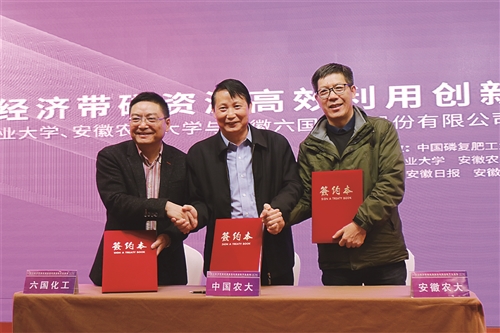 会上,中国农业大学教授、资源与环境学院副院长江荣风,安徽农业大学党委常委、副校长姚佐文,安徽六国化工副总经理、总工程师沈浩,代表三方签署战略合作协议。