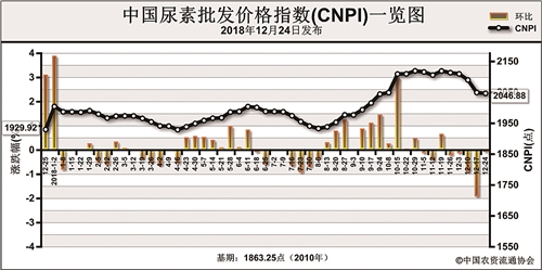 上周(12月17日-12月21日)国内尿素开工率有所下跌,需求受淡储招标影响有所提振,尿素价格止跌企稳。12月24日中国尿素批发价格指数(CNPI)为2046.88点,环比下跌2.56点,跌幅为0.12%;同比上涨116.96点,涨幅为6.06%;比基期上涨183.63点,涨幅为9.86%。